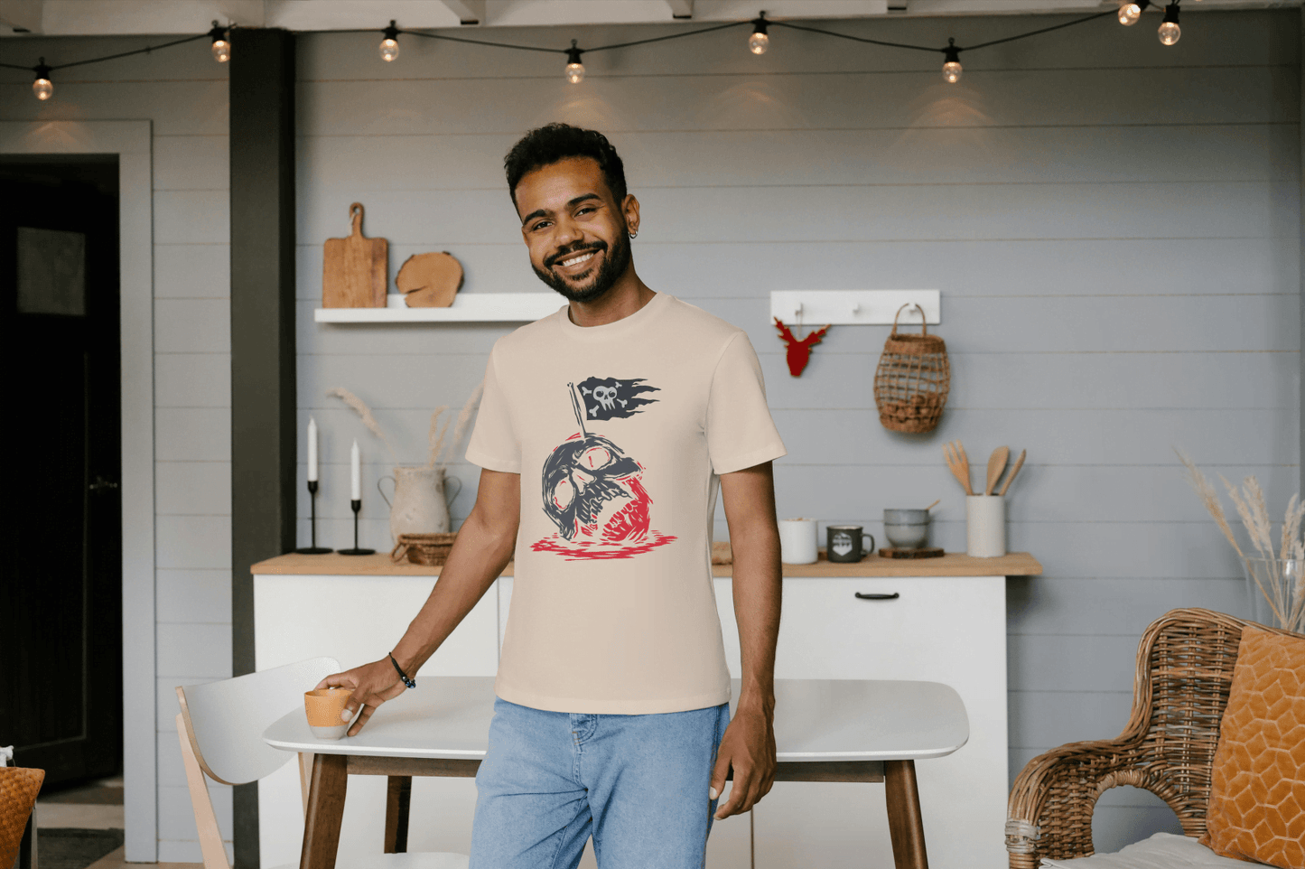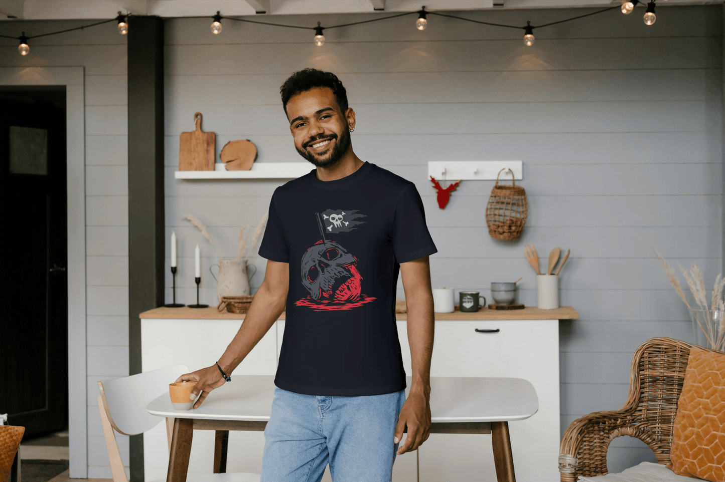 Features a design of a stylized skull with a small flag bearing another skull and crossbones impaled through its top, surrounded by abstract splatters or waves at the base, all in black on a white t-shirt.